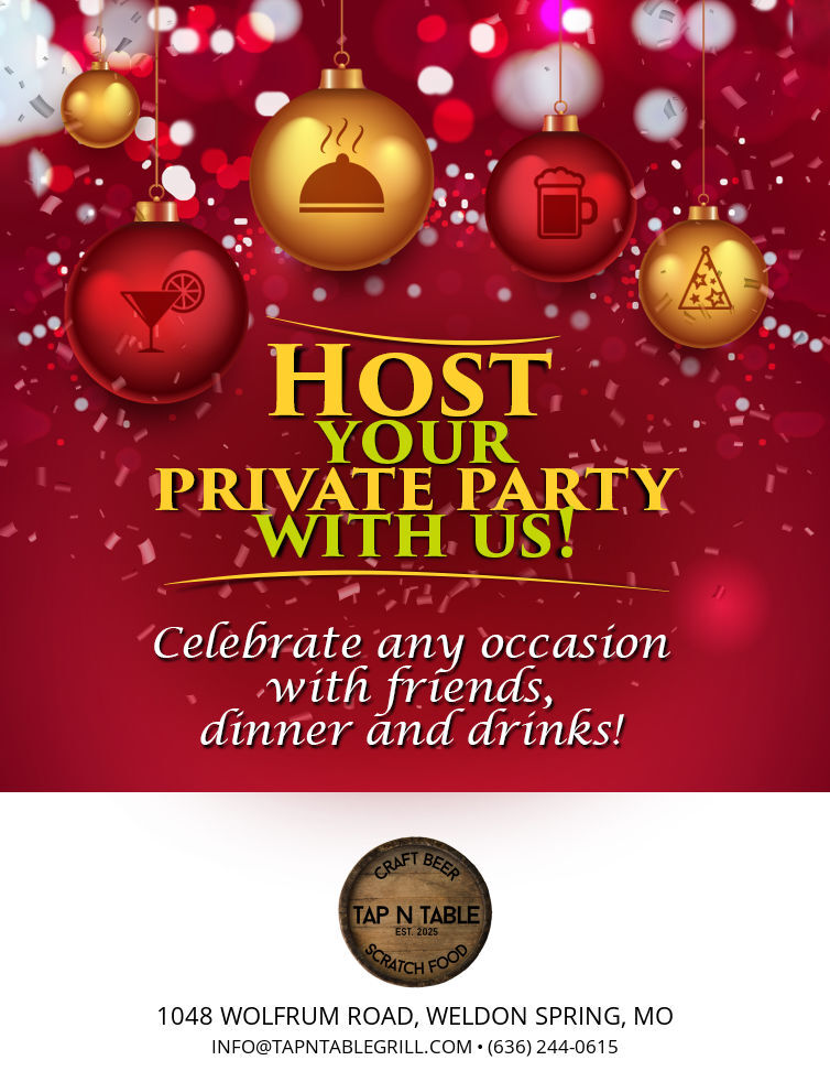 Celebrate in style with a private gathering at TapNTable Bar & Grill. From birthdays to corporate events, we provide a customizable menu, drink options, and a space designed for good times. Relax, entertain, and let us take care of the details - your guests will leave impressed.